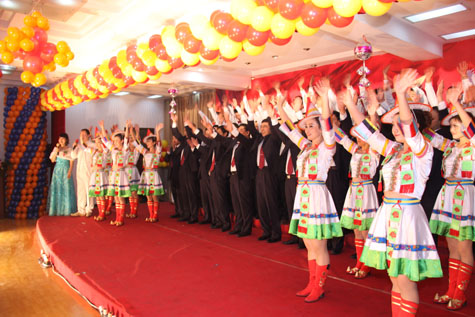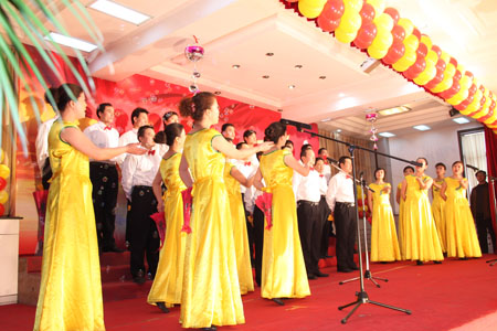 團(tuán)拜會的最后,公司員工一起合演《歌唱祖國》,喜慶的表演,整齊的著裝,人浪涌動,煙花閃爍,把整個活動推向了高潮。