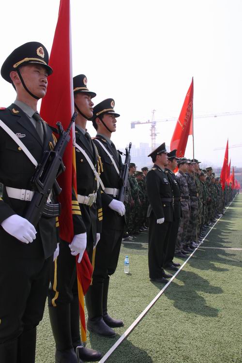 上午10時,點驗大會在嘹亮的軍歌聲中拉開序幕。預備役官兵軍容嚴整,雄姿勃發(fā),精神抖擻,士氣高昂,充分展示了當代預備役軍人的良好精神風貌,展現(xiàn)了部隊良好的軍政素質(zhì)和優(yōu)良的戰(zhàn)斗作風。3名儀仗隊員護衛(wèi)著軍旗,邁著矯健的步伐從主席臺南側(cè)走到隊列北側(cè)。1500余人的預備役軍人身著整齊的軍裝,按照各自編制,在操場排成整齊的方隊,接受了首長的檢驗并進行了宣誓儀式。點驗結(jié)束后,預備役官兵進行了擒敵拳、盾牌警棍術(shù)和防爆隊形等三個科目的匯報演示。通過集結(jié)點驗,鍛煉提高了團首長機關(guān)和營連各級指揮員的組織協(xié)調(diào)能力,探索研究了組織全團集結(jié)點驗的方法路子,錘煉了部隊,強化了作風,有效提高了部隊快速動員和隨時應召的能力。