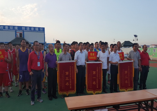 建設(shè)單位指揮部史副指揮長、工程部趙部長、監(jiān)理中企建發(fā)公司隋總為獲得冠軍、亞軍、季軍的籃球隊(duì)頒獎