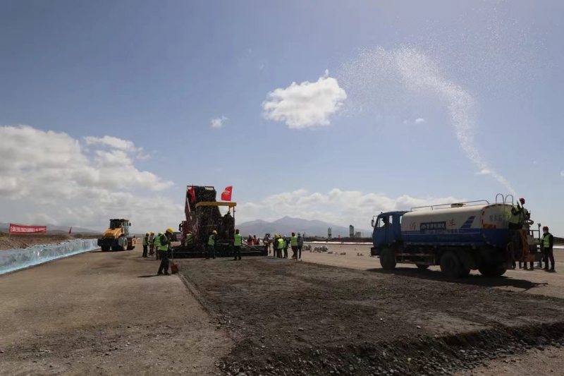 5月28日,伴隨著第一車水泥穩(wěn)定砂礫混合料緩緩倒入攤鋪機料斗,標志著由我司承建的新疆和靜(巴音布魯克)機場飛行區(qū)跑道水穩(wěn)基層試驗段施工正式拉開序幕。