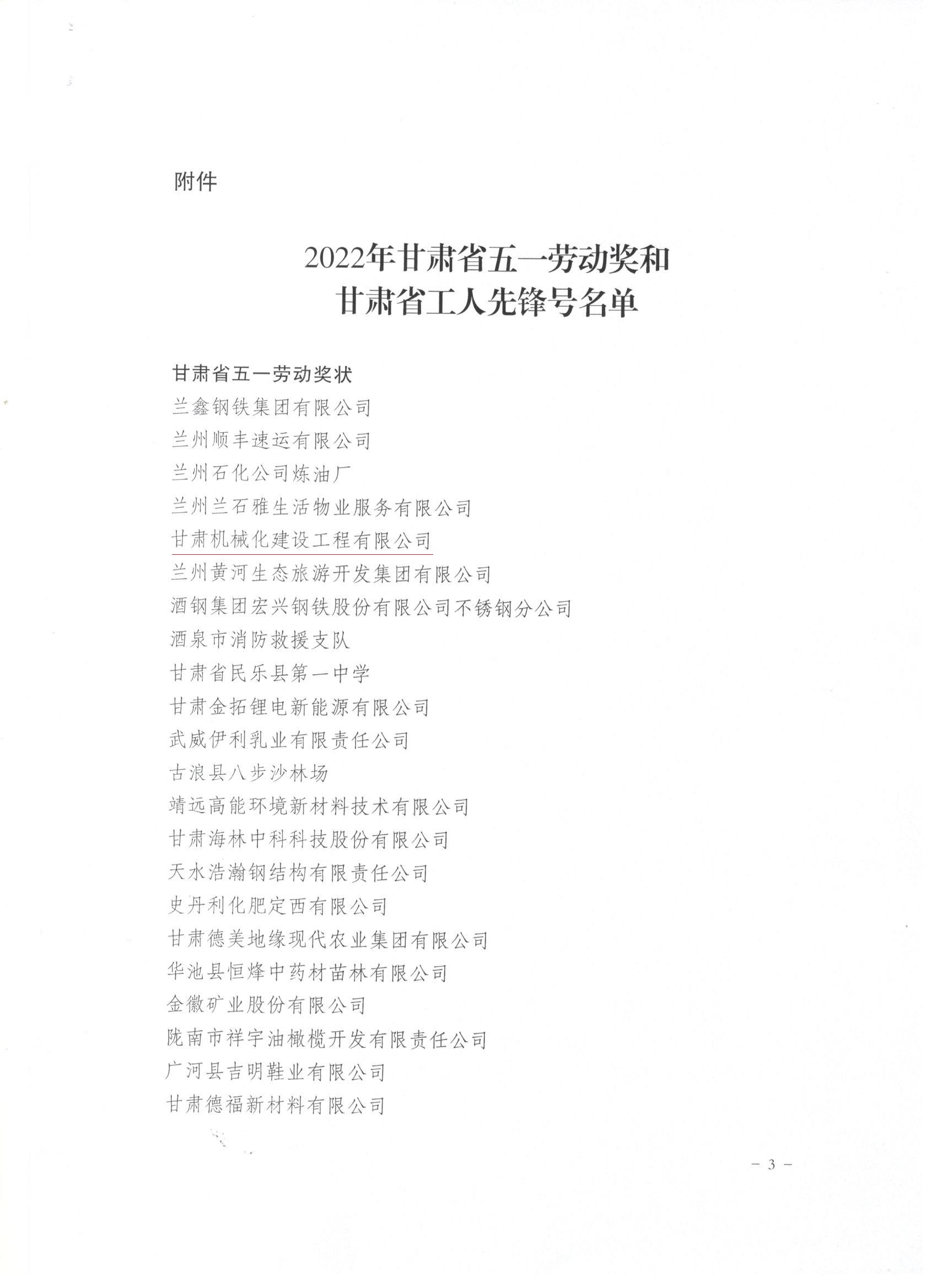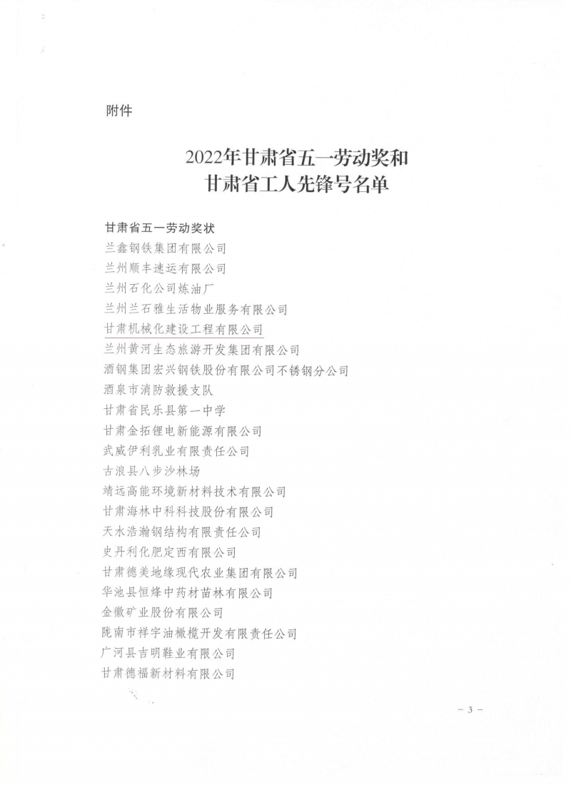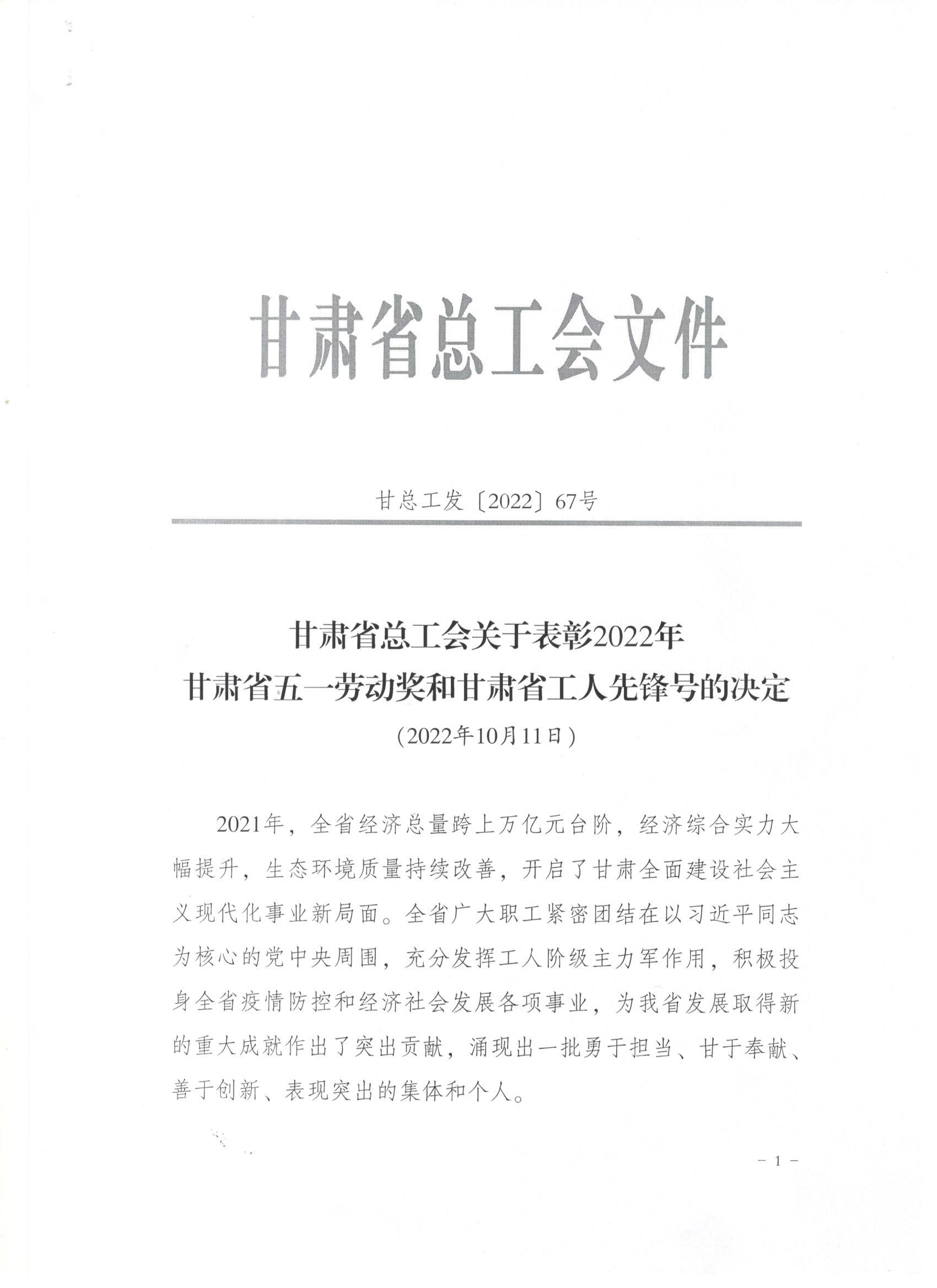 近日,甘肅省總工會發(fā)布了《關(guān)于表彰2022年甘肅省五一勞動(dòng)獎(jiǎng)和甘肅省工人先鋒號的決定》,我司被授予“甘肅省五一勞動(dòng)獎(jiǎng)”和“甘肅省工人先鋒號”。