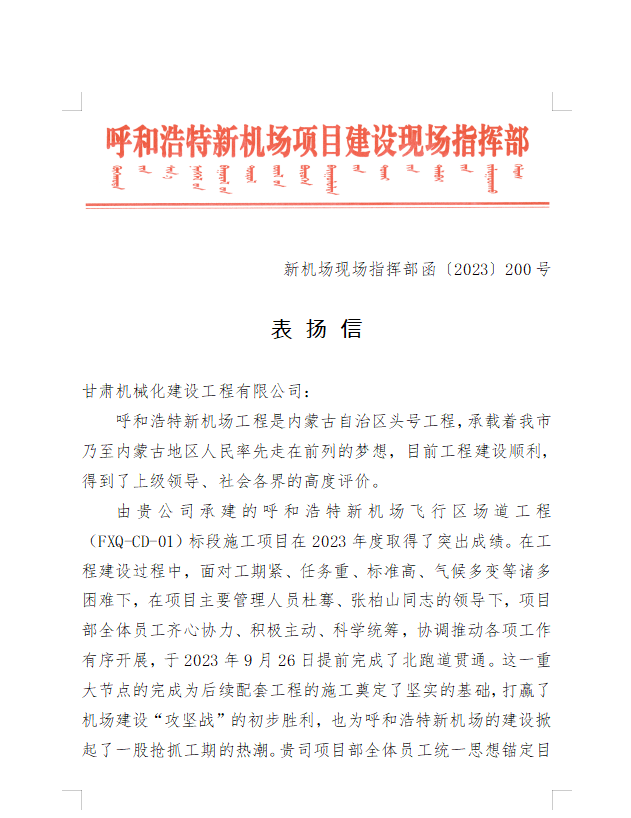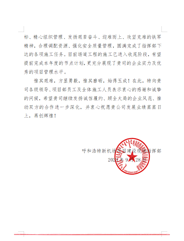 2023年9月28日,呼和浩特新機場項目建設現(xiàn)場指揮部給我司發(fā)來表揚信,信中充分肯定了我司在呼和浩特新機場項目建設中項目部全體員工統(tǒng)一思想錨定目標、精心組織管理、發(fā)揚艱苦奮斗、迎難而上、攻堅克難的鐵軍精神,合理調(diào)配資源、強化安全質(zhì)量管理,圓滿完成了指揮部下達的各項施工任務。