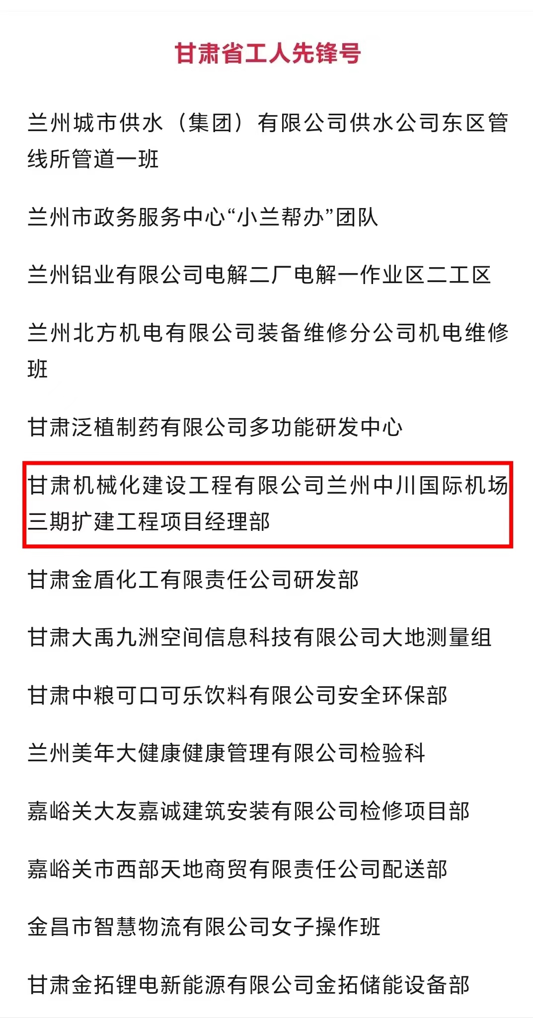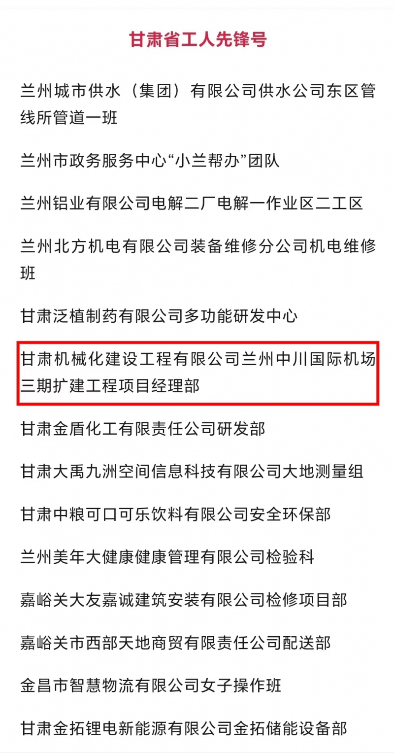 近日,甘肅省總工會(huì)發(fā)布了2024年甘肅省“五一勞動(dòng)獎(jiǎng)和甘肅省工人先鋒號(hào)”擬表彰對象的公示。我司蘭州中川國際機(jī)場三期擴(kuò)建工程項(xiàng)目經(jīng)理部被授予“甘肅省工人先鋒號(hào)”,該獎(jiǎng)的獲得既是對項(xiàng)目團(tuán)隊(duì)長期拼搏奮斗的肯定,也是對公司“和諧共進(jìn)、追求卓越”企業(yè)精神的肯定。